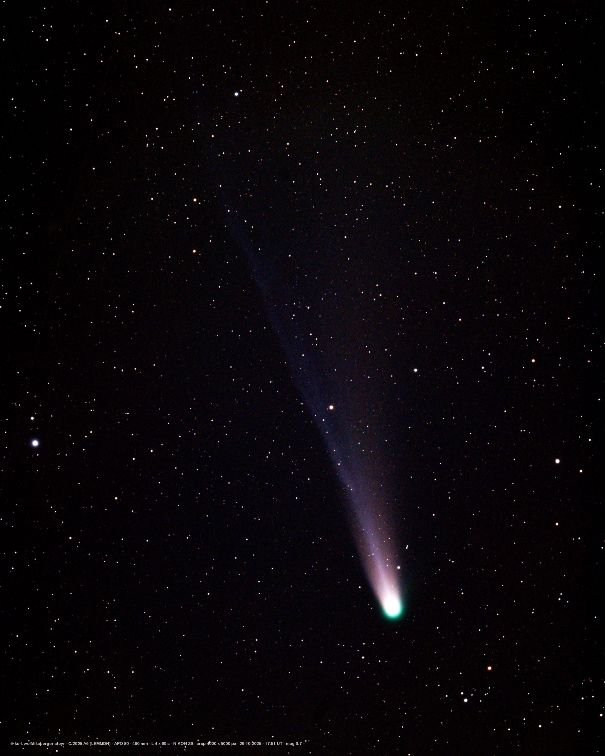 Am 24. Oktober 2025 endlich klarer Himmel allerdings erst nachdem zahlreiche Wolkenfelder durchgezogen sind und der Komet noch am Himmel stand - denn um 21:00 geht er unter. So hab ich den APO 80 - 480 mm mit der Kamera NIKON Z6 und den Flattener TSFLAT2 mit Nebelfilter auf der Montierung GEM 28 EC auf das Ziel gerichtet. Schon das Alignment war schwierig, da vorerst kein Leitstern sichtbar war. Um 20:00 sind mir dann einige Aufnahmen mit ca. 1 min Belichtingszeit gelungen. Das Bild wurde aus 6 Aufnahmen mit ca. 58 s gestackt. Der Komet hatte heute (24.10.) mag 3.8 - er ist nur mehr 92 mio km von der Erde entfernt. - Eine Detail-Auswertung zeigt, dass der Ionenschweif sich aufspaltet.