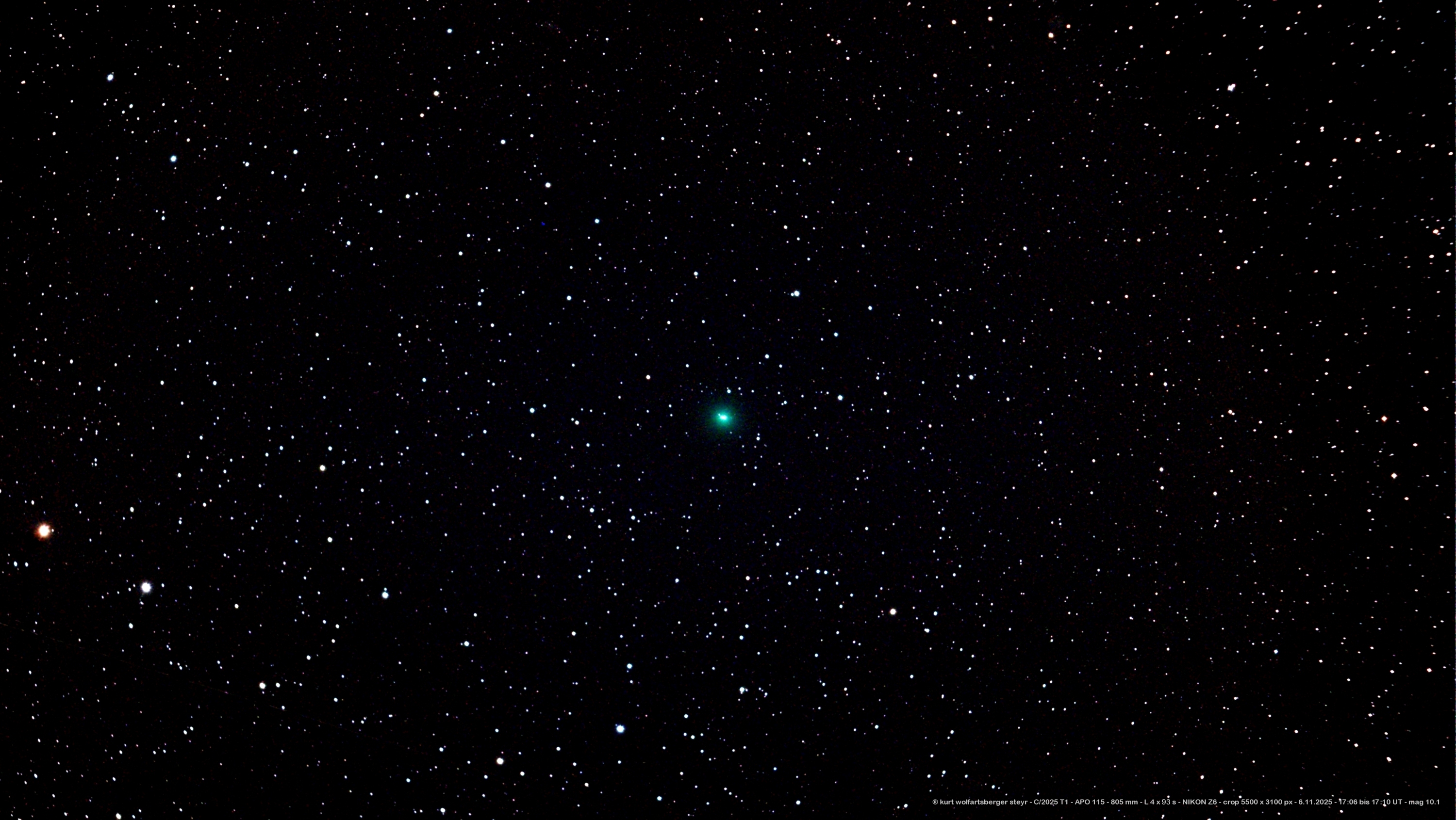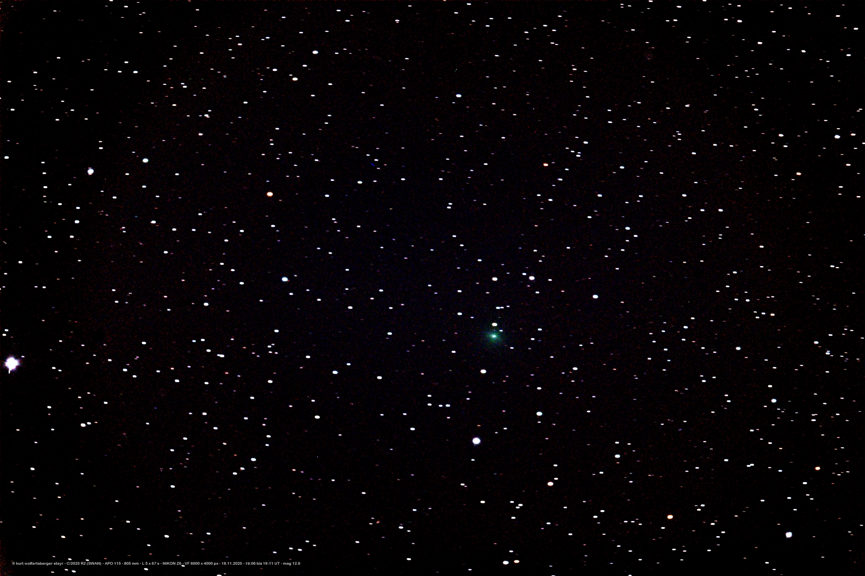 Am 18. November 2025 klarer Himmel aber kalt. Ich hab den APO 115 - 805 mm mit der Kamera NIKON Z6 und den Flattener TSFLAT2 mit Nebelfilter auf der Montierung GEM 28 EC eingerichtet und Alignment mit Atair gemacht. Um 18:00 hab ich dann einige Aufnahmen mit ca. 90 sec gemacht. Der Komet ist 155 mio km entfernt und hatte ca. mag 10. Das Koma ist grün, ein Schweif war nicht sichtbar. Anfang Dezember wird der Komet den nächsten Punkt zur Sonne erreichen - mal sehen was dann passiert. Das Bild wurde aus 4 Aufnahmen mit 93 s gestackt. - Nach zwei Stunden hab ich denn noch den C/2025 R2 (SWAN) eingestellt, aber der hat nur mag 12 bis 13 und ist kein lohnendes Objekt mehr.