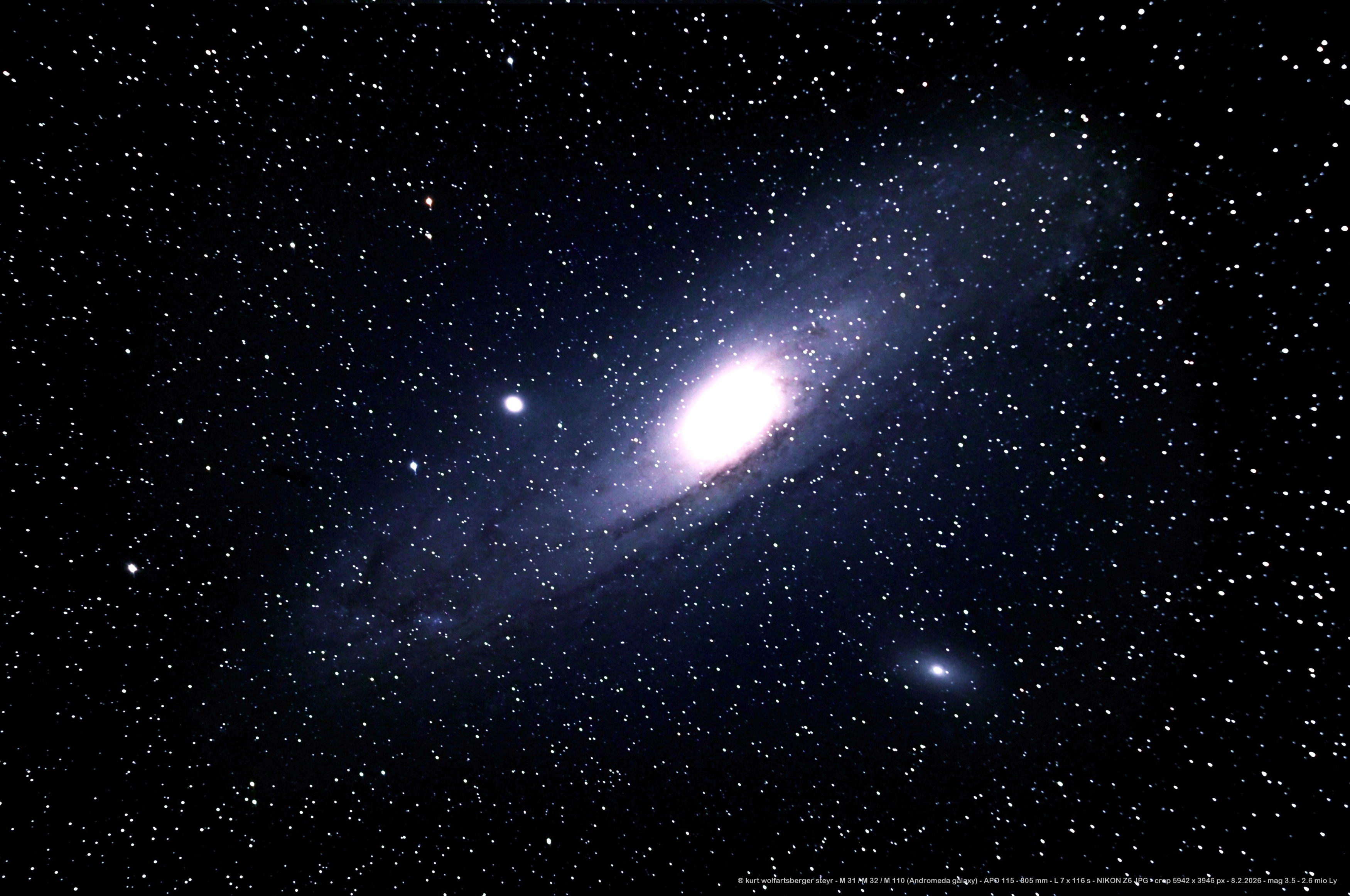 Am 27. und am 28. 12 2024 war traumhaftes Wetter und ich habe an beiden Tagen sowohl den APO 80 als auch den APO 115 verwendet. Die Abwesenheit des Mondes hat dem fotografieren sehr geholfen - er geht erst nach Mitternacht auf. Mit dem Flattener TSFlat2 und dem Nebelfilter konnten Belichtungszeiten von mehr als 2 Minuten realisiert werden - dementsprechend wurden die Bilder. Beim M 31 ist es mir gelungen noch ca. 20 Bilder zusätzlich aufzunehmen, was dem Resultat des neuen Bildes sehr geholfen hat. Auch der APO 115 am zweiten Tag hat die Qualität des Bildes vom M 33 sehr verbessert. - Am 29. 12. 2024 habe ich noch einige Aufnahmen dazugemacht bzw. gibt es sogenannte Kombi-Bilder vom 27. und 29. die gemeinsam gestackt wurden.