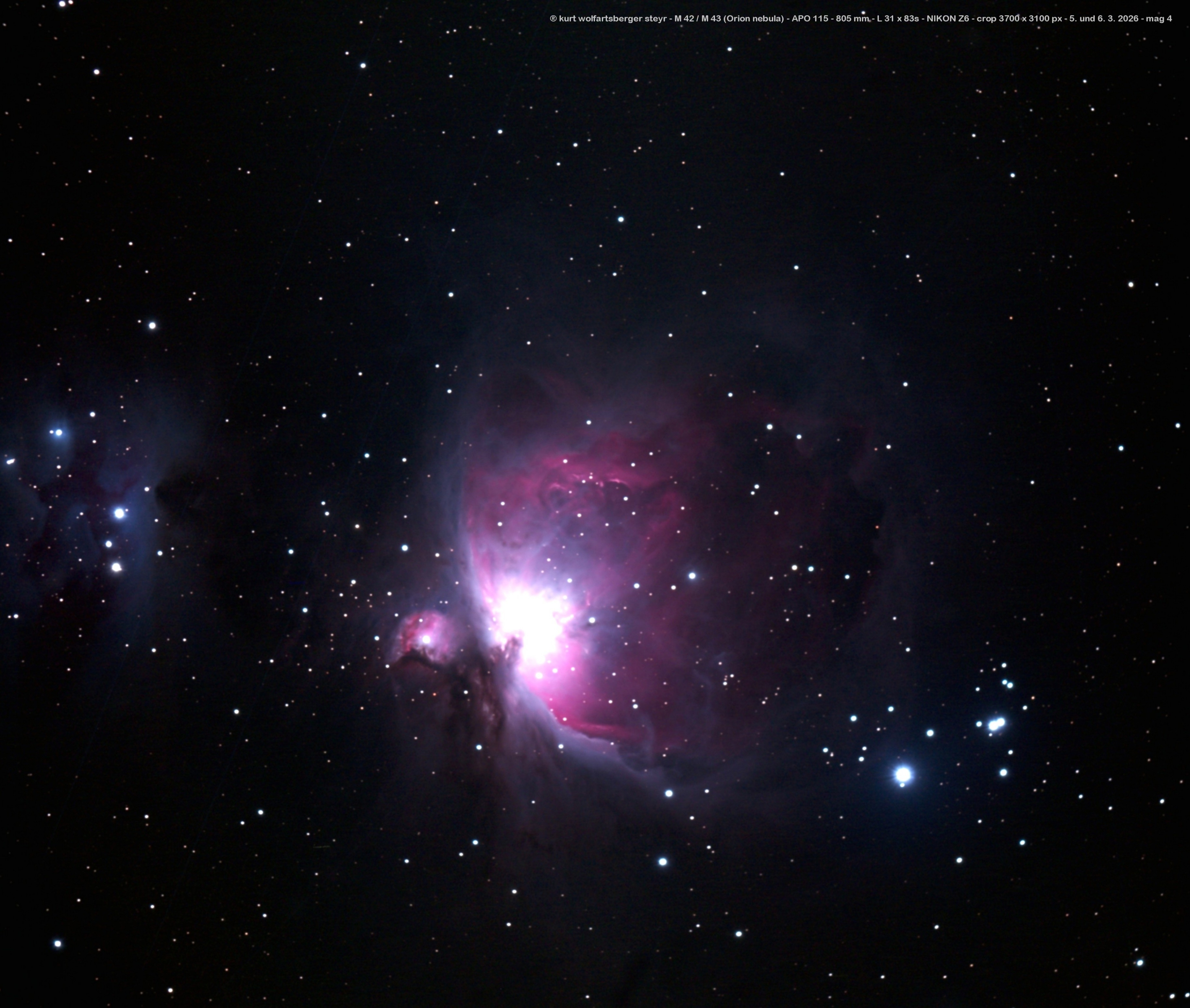 Dipl.-Ing. Kurt WOLFARTSBERGER hat Maschinenbau an der TU Wien studiert und sein Hobby ist seit der Mittelschulzeit am Bundesrealgymnasium in Steyr die Astronomie. Seine Eltern haben ihn dabei sehr unterstüzt und haben ihm sehr bald ein KOSMOS Linsenfernrohr 50/500 mm gekauft mit dem ich so manchen Jupitermond des nachts beobachtet habe. Auch habe ich sehr bald einen Hobby-Astronomen aus der Stadt Steyr kennen gelernt, der sich in seinem Garten eine Sternwarte gebaut hat: Wilhelm AURACHER. Er war handwerklich sehr geschickt und hat Linsen und Spiegel selbst geschliffen und poliert und ganze Teleskope gebaut. Von Ihm habe ich dann mein erstes Spiegelteleskop - einen NEWTON 100/1000 mm gekauft. Eines seiner Teleskope steht heute noch am Gahberg in Weyregg auf der Sternwarte des Astronomischen Arbeitskreises Salzkammergut, bei dem ich seit meinem Ruhestand auch Mitglied geworden bin. Ich bin auch in gutem Kontakt mit Dipl.-Ing. Josef HAGER, der im Verein sehr aktiv ist. Er hat mir auch seinen Newton N200 - 800 mm, F4 geliehen, den ich wann immer das Wetter es zuliess eifrig zum fotografieren verwendet habe. Heute verwende ich zwei APO Linsenfernrohre - APO 80 - 480 mm und APO 115 - 805 mm zum fotografieren mit der NIKON Z6 Kamera, beide montiert auf der iOptron GEM28EC, die sich sehr gut für diese Teleskope eignet. Bei gutem seeing sind Belichtungszeiten von bis zu zwei Minuten pro Bild möglich.