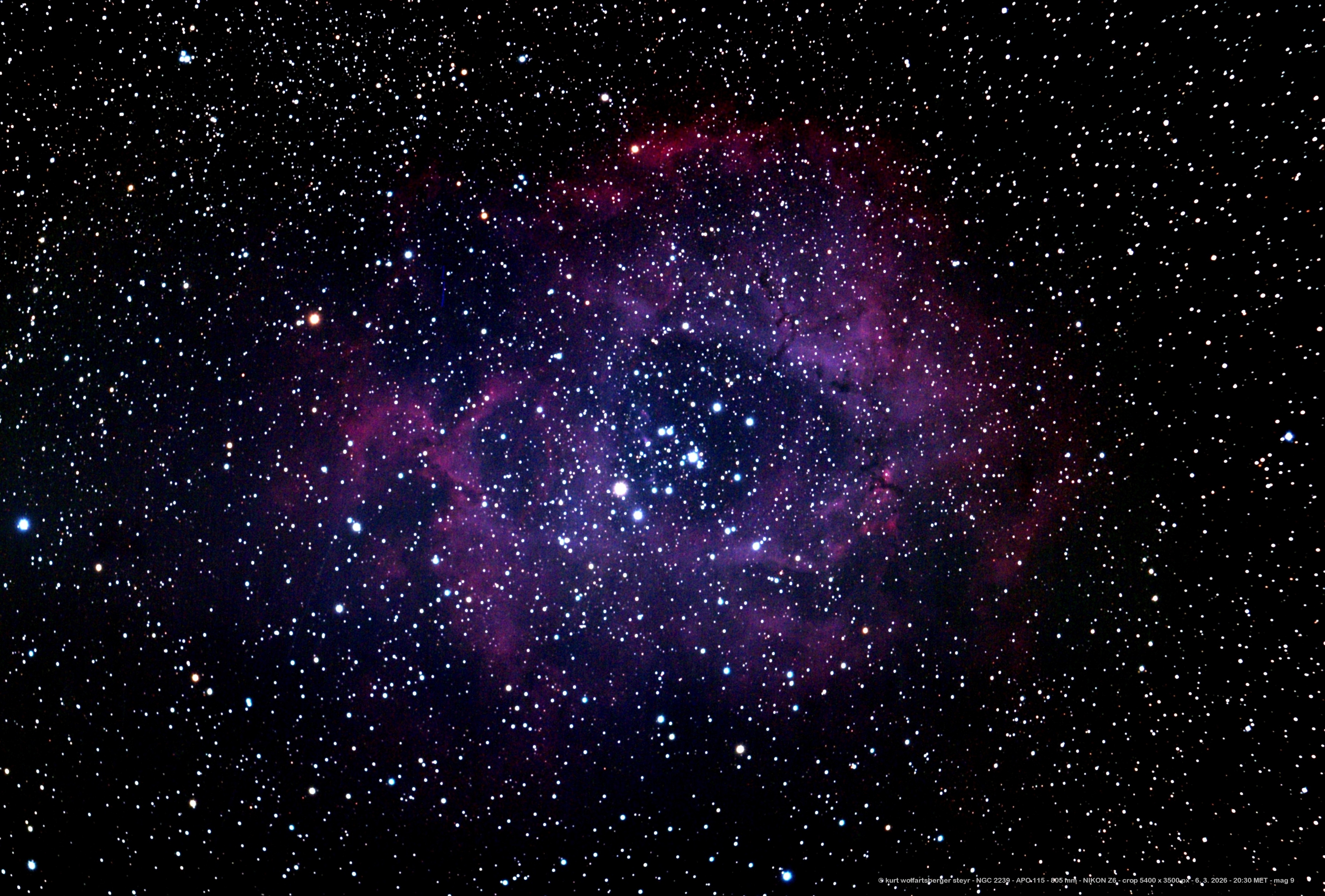 Der Rosettennebel und Sternhaufen im Sternbild Einhorn, NGC 2239 bis 2244, aufgenommen am 3. 4. 2025