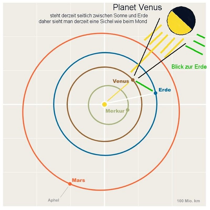 Am 23. November 2021 habe ich die Venus als Abendstern mit der SONY alpha58 in der Dämmerung eingefangen. Das Detailfoto wurde mit dem Maksutov MCX127 mit 1900 mm Brennweite und SONY alpha 58 mit 2x digital zoom gemacht. Der Planet zeigt eine Sichel und ist ca. 40% beleuchtet. Leider war die Luft sehr unruhig. - Am 3. Dez. 2021 war die Luft etwas besser (tamron 90 mm - 85 mm - 55 mm).