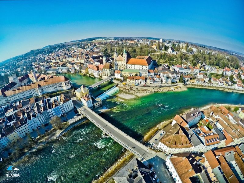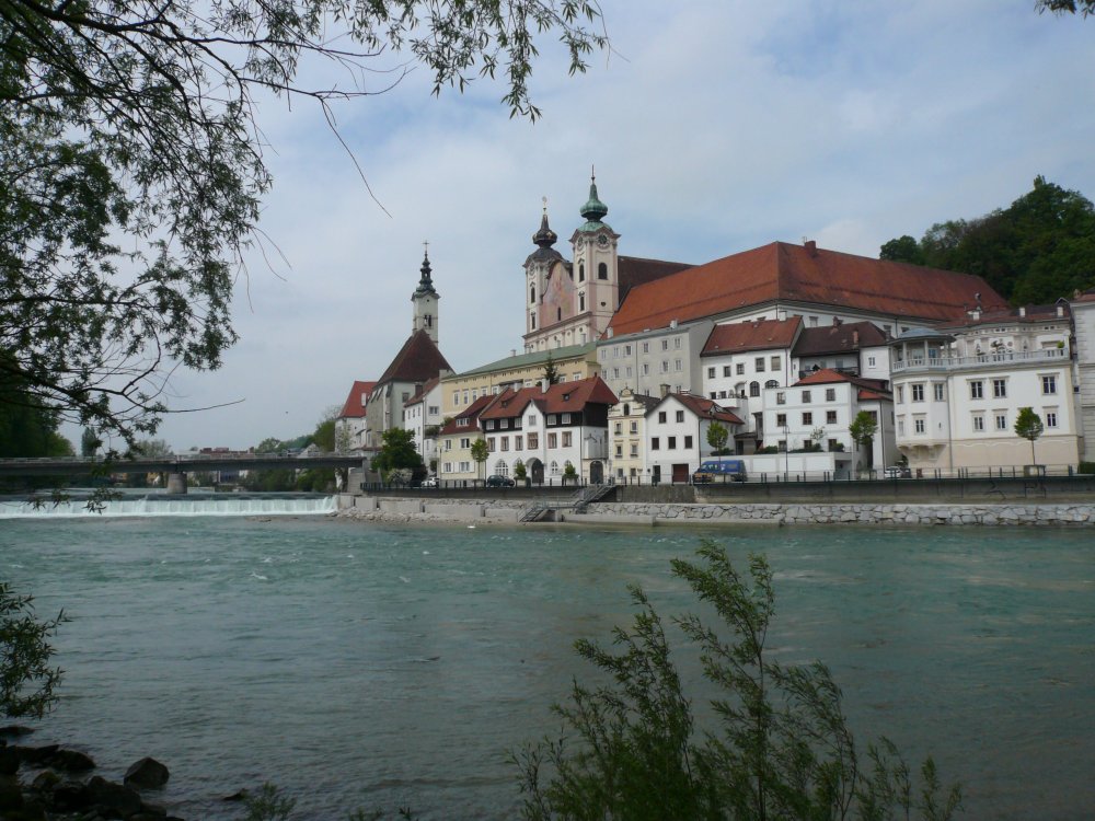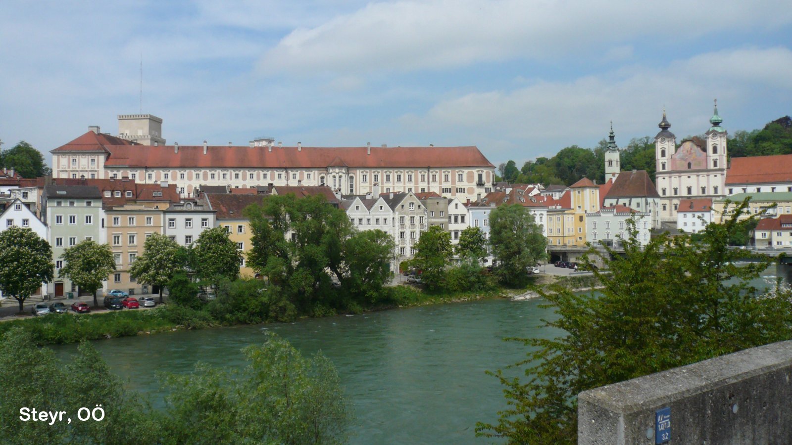 Steyr in Oberösterreich hat das Stadtzentrum um den Zusammenfluss der Flüsse Enns und Steyr, wie man auf den Fotos auch gut erkennen kann. Die Stadt ist mehr als 1000 Jahre alt und wurde um 980 n.Chr. gegründet. Heute hat Steyr ca. 38.000 Einwohner (2014) und ist die 3. grösste Stadt in Oberösterreich nach Linz und Wels. Berühmt ist auch noch das Schloss Lamberg, die frühere "Styraburg". Auf dem Bild rechts nahe dem Zusammenfluss von Enns und Steyr sieht man die Kirche St. Michael und das Bürgerspital. Steyr ist bekannt für seine Eisenerzeugung und heute sind die Werke "Steyr-Nutzfahrzeuge" von MAN und der Magna Konzern sowie SKF Kugellager und das BMW-Motorenwerk die prominentesten Vertreter der grossen Industrie in Steyr. Seit die Fachhochschule in Steyr ist gibt es eine Veränderung beim Stadtbild, da viele junge Leute und Studenten nun die Innenstadt bevölkern.