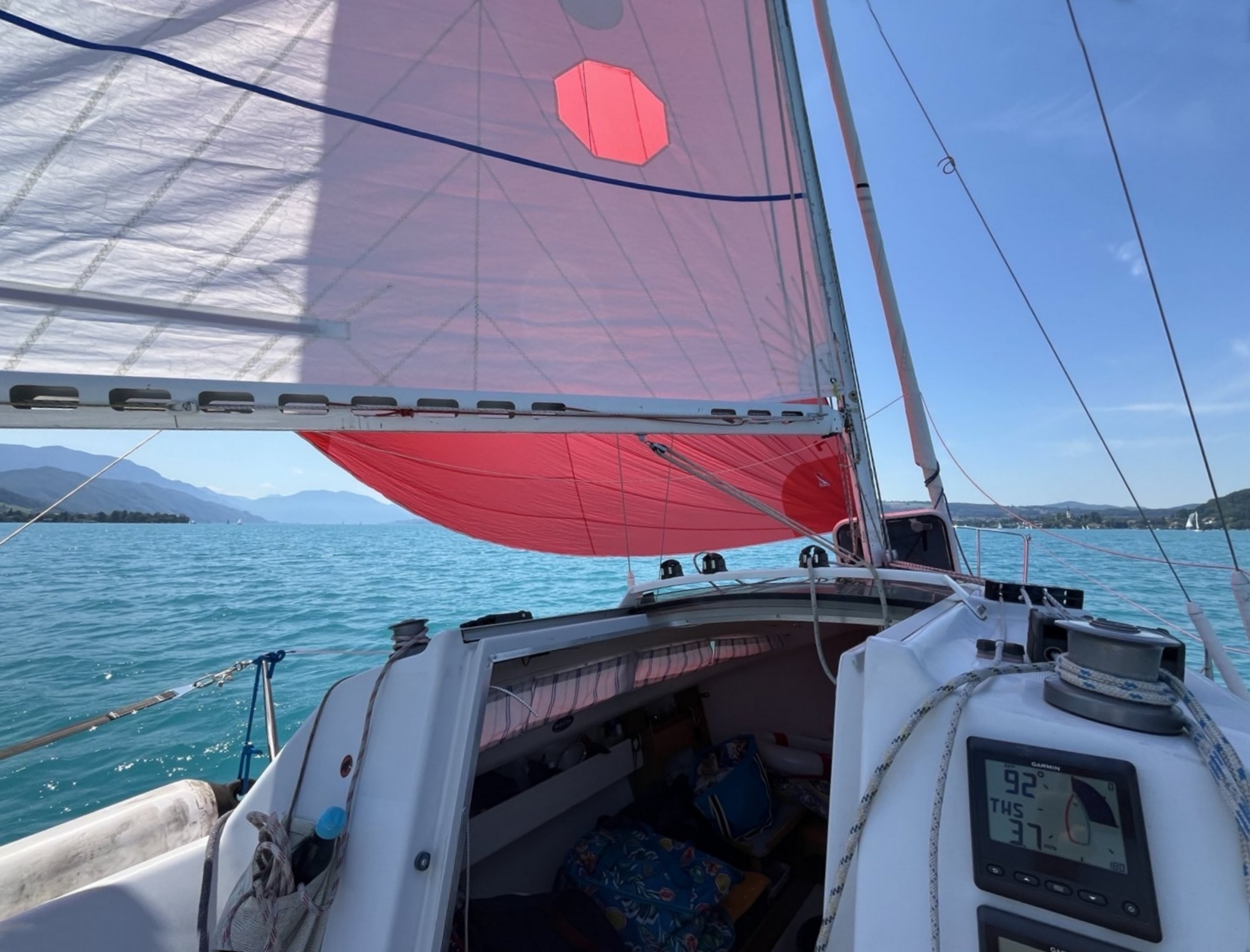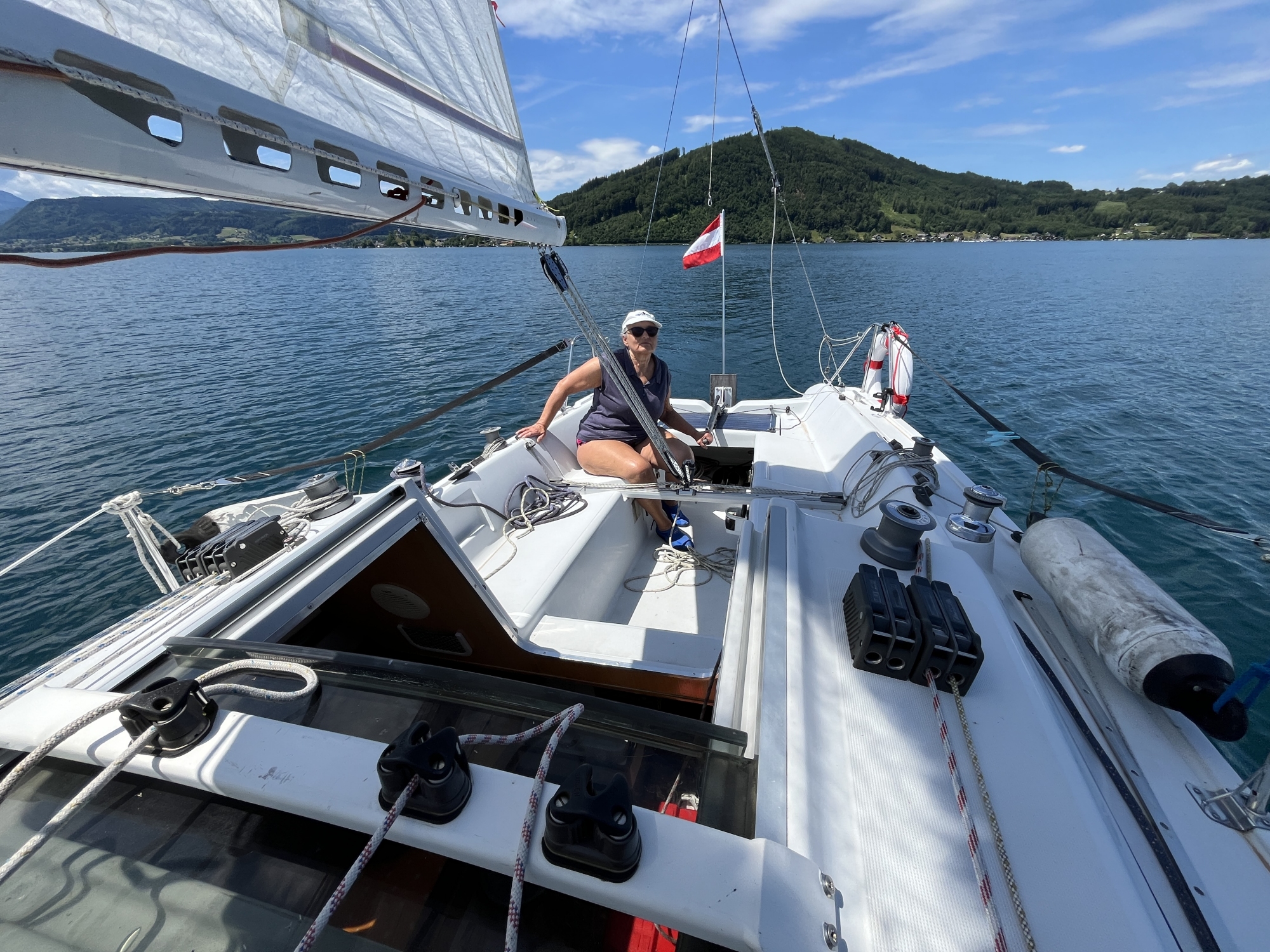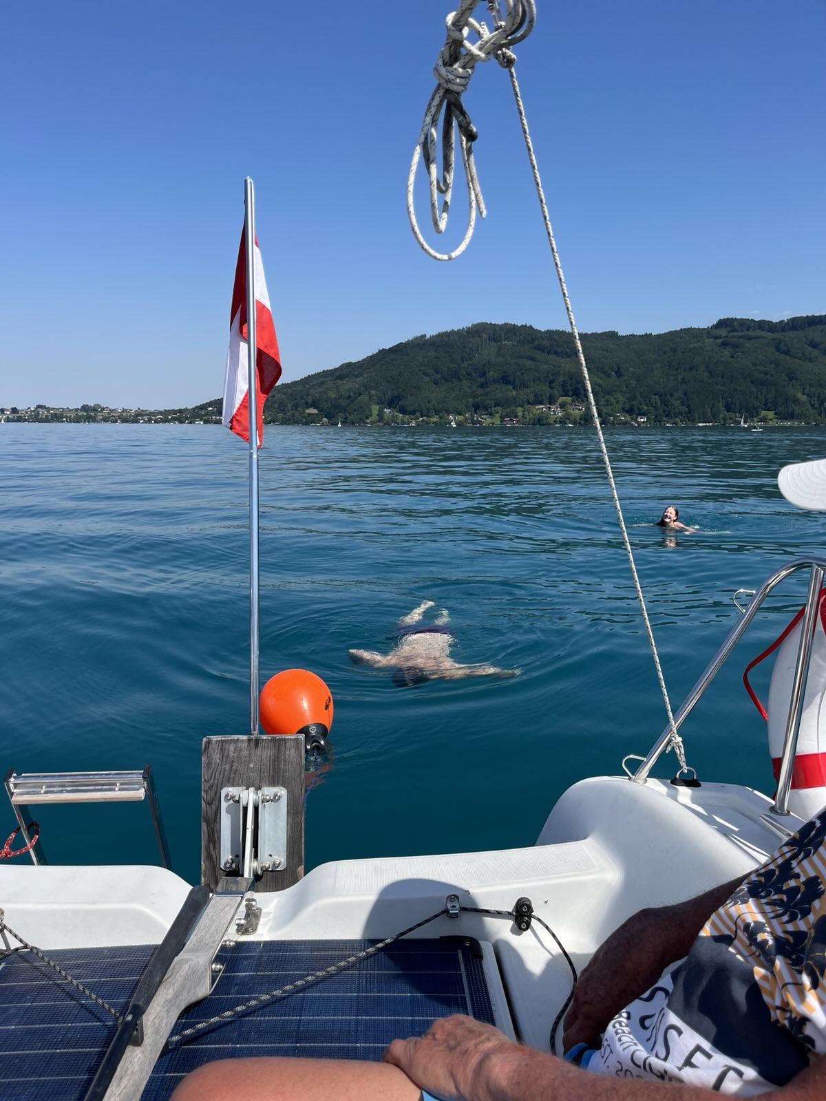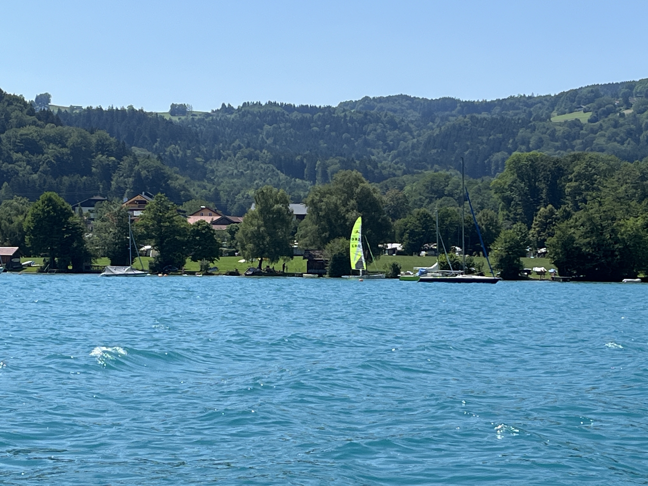 Das wechselhafte, heisse Wetter dauert an - trotzdem verbrachten wir einen schönen Segeltag am 15. Juli 2024 am Attersee. Der Wind war leicht und stabil, aber sehr drehend aus Nord-Ost. Wir fuhren zuerst nach Kammer und dann mit dem Genaker nach Süden bis zum Campingplatz in Dexelbach. Die Rückfahrt auf der Kreuz war wegen den Winddrehungen etwas mühevoll, aber um ca. 17 Uhr waren wir wieder zurück und gingen noch baden. Die Wassertemperatur war gemessene 25 Grad. Wir beschlossen den wundervollen Tag in der Pizzeria Avocado mit Elfi und Sepp in Weyregg.