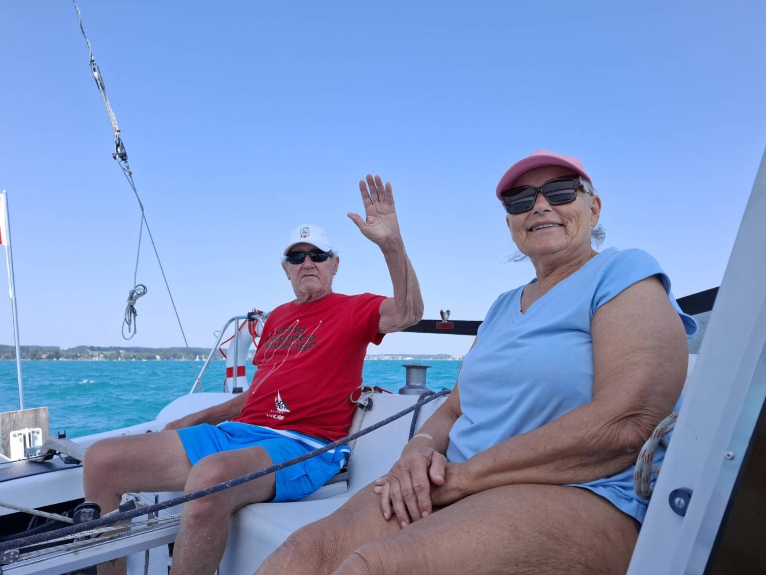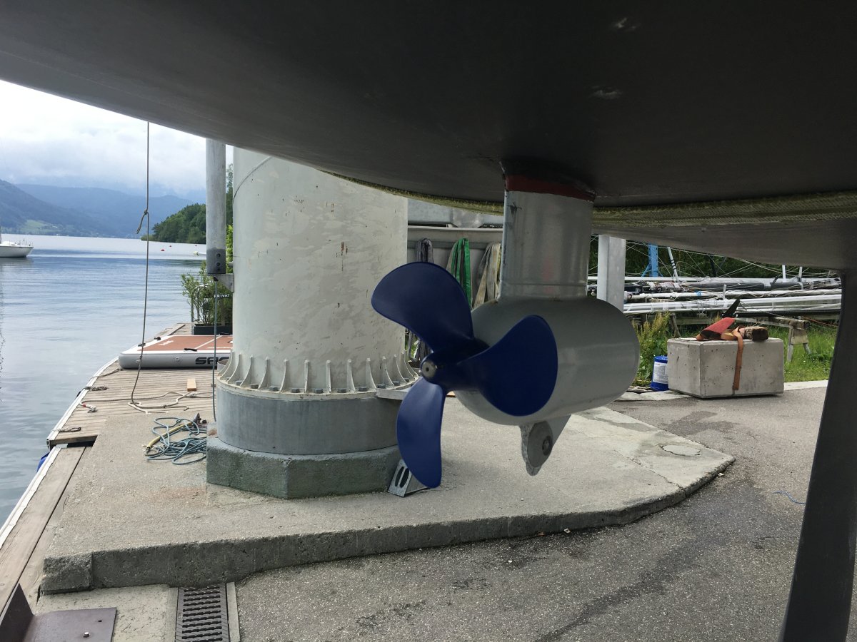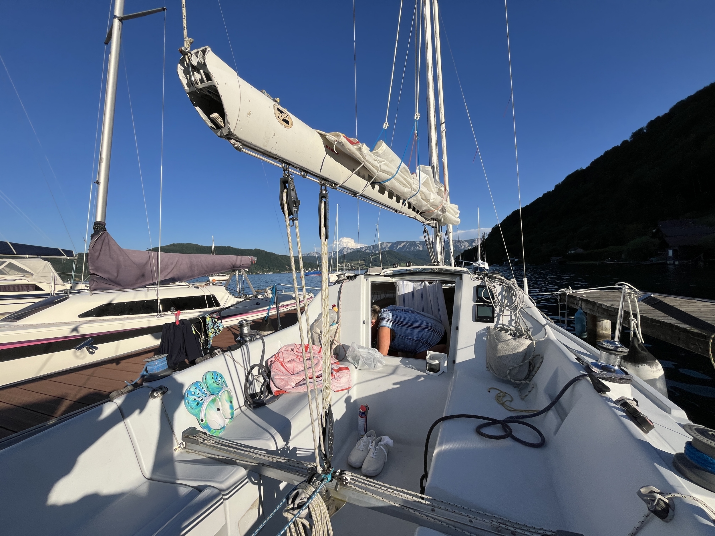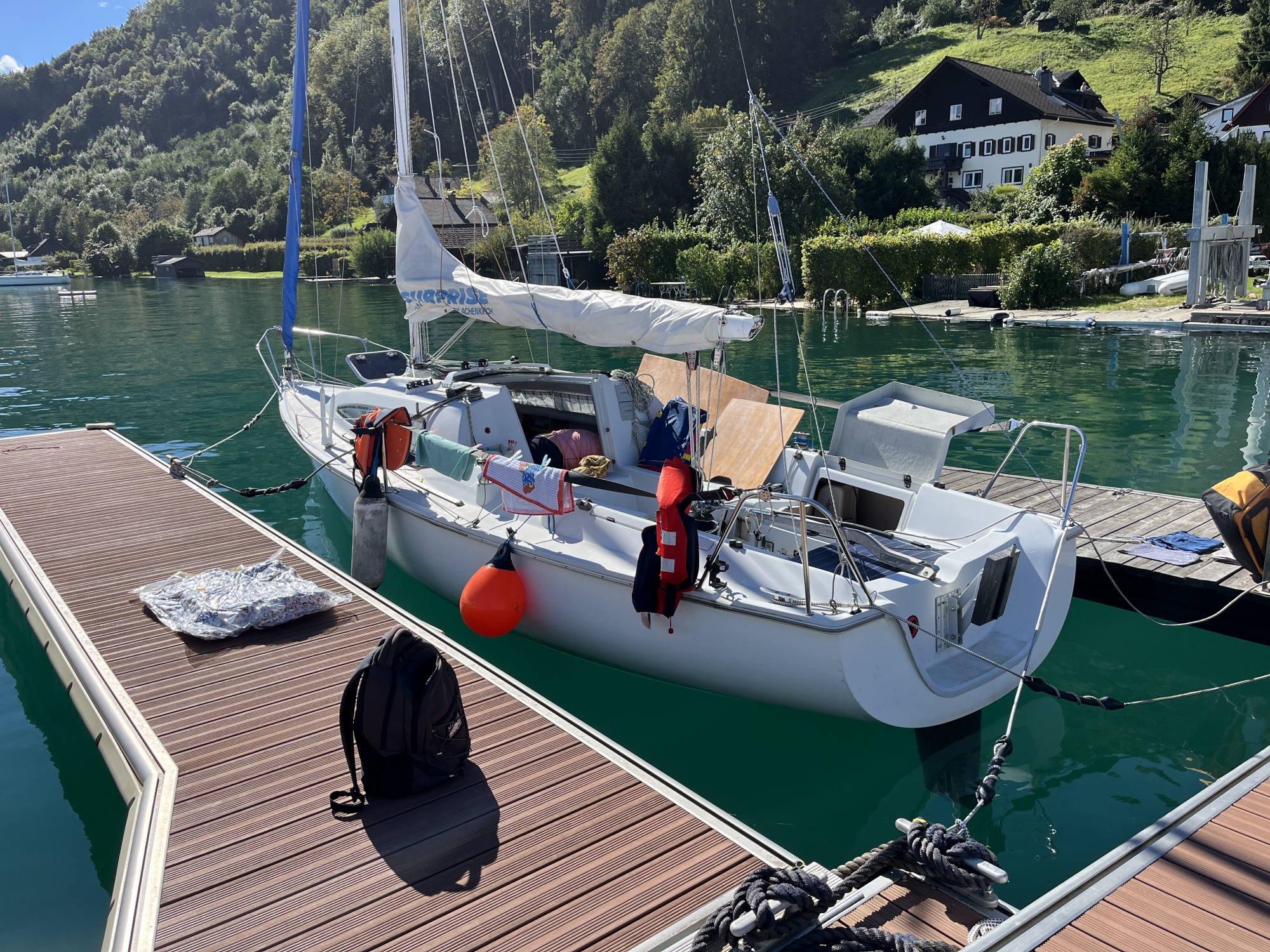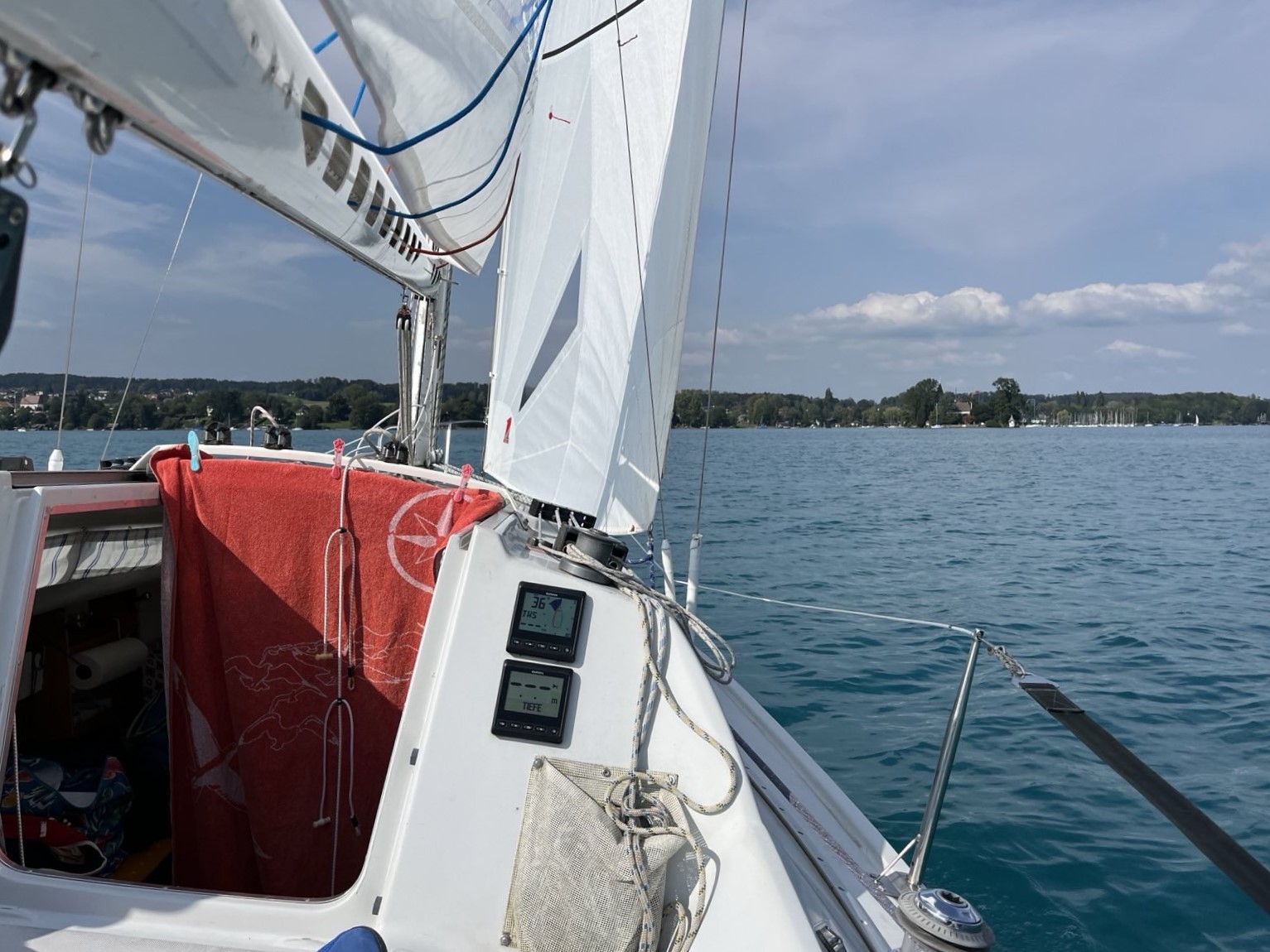 Nach dem Sturm am 13. 8. 2024 - bei dem die Steuerbord Reling der Surprise verbogen wurde, haben wir den Steher, der bei der Fa. LAIMER repariert wurde, wieder montiert. Nach einer Ausfahrt zum Baden ist um 15 Uhr dann auch noch leichter Westwind aufgekommen, sodass wir auch zum Segeln gekommen sind.