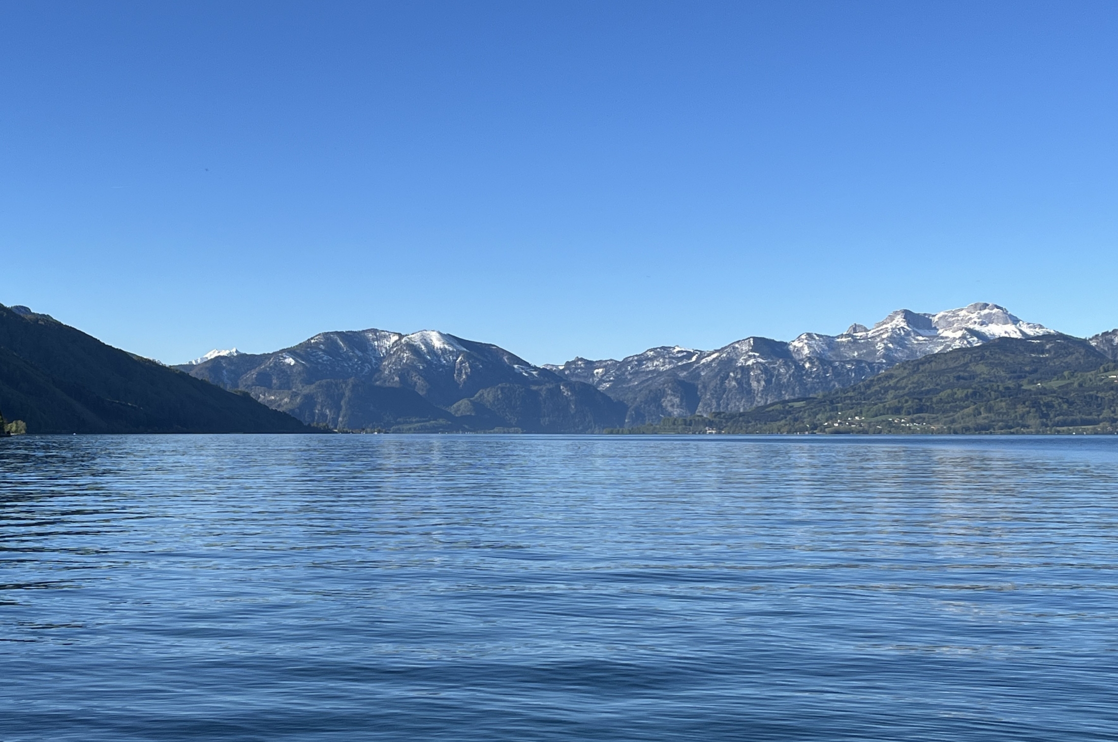 Der Schafberg in der Ferne - Buchberg und Attersee am Wind