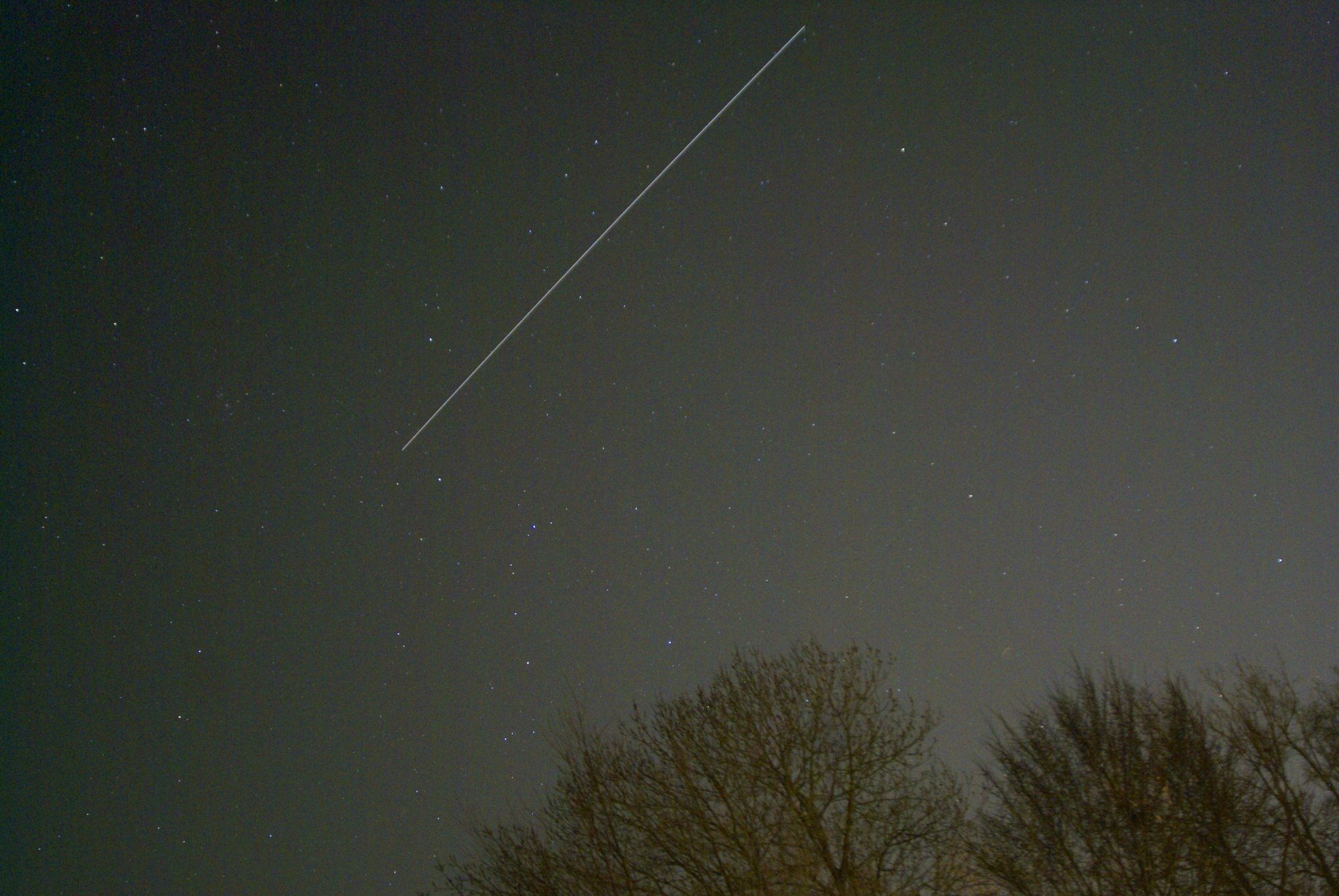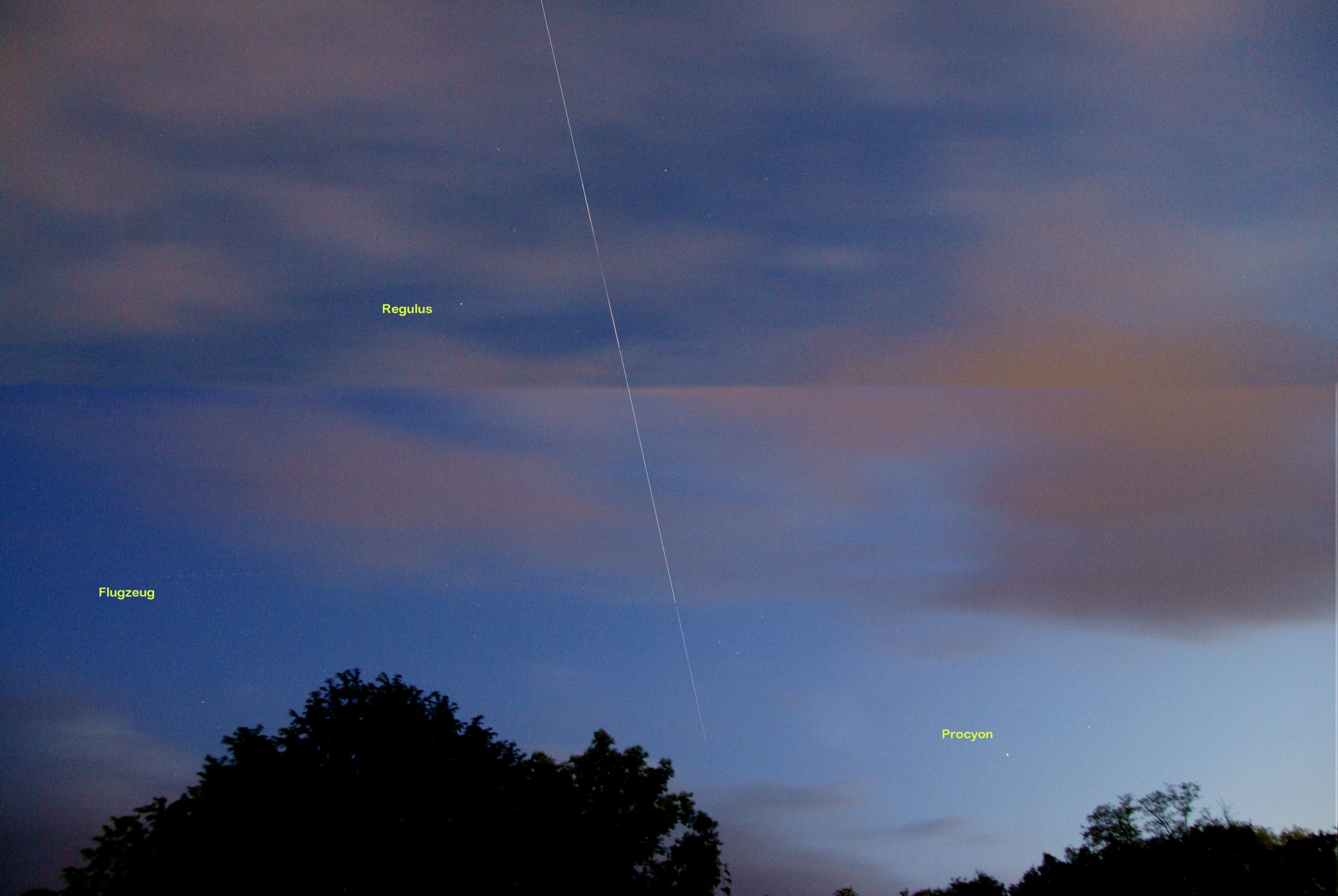 Am 17. Mai 2022 um 20:44 hab ich den Flug der ISS über-Steyr beobachten können. Das Foto ist zusammengesetzt aus zwei Flugbereichen von je ca 25 sec und mit dem tamron Objektiv mit 18 mm Brennweite aufgenommen. Im Hintergrund schimmern die ersten Sterne (Regulus vom Löwen und Procyon vom Kleinen Hund) schon durch. Links unten ist natürlich auch ein Flugzeug dabei. Die Aufnahmen waren nachgeführt mit dem Omegon LX3.