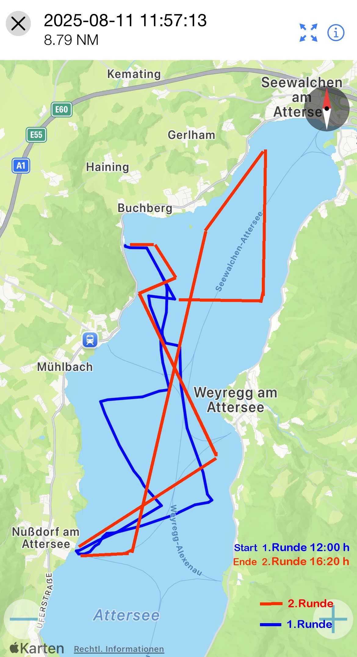 Am 11. 8. 2025 war Rosenwind vorhergesagt und den gab es dann auch. Wir waren um 12 Uhr am See und fuhren Richtung Nussdorf um Helmut abzuholen. Der Wind hatte zwischenzeitlich 3 - 4 Bft erreicht und es war wirklich ein Super Segelltag. Mit Helmut fuhren wir dan nach Seewalchen - 20 kn Böen wurden problemlos gemeistert - und wieder zurück nach Nussdorf um ihn dort wieder abzusetzen. Anschliessend fuhren Martha und ich alleine zur Marina zurück. Um 16:20 h waren wir im Hafen. Die ganze Runde dauerte mehr als 4 Stunden und es waren ca 17 sm.