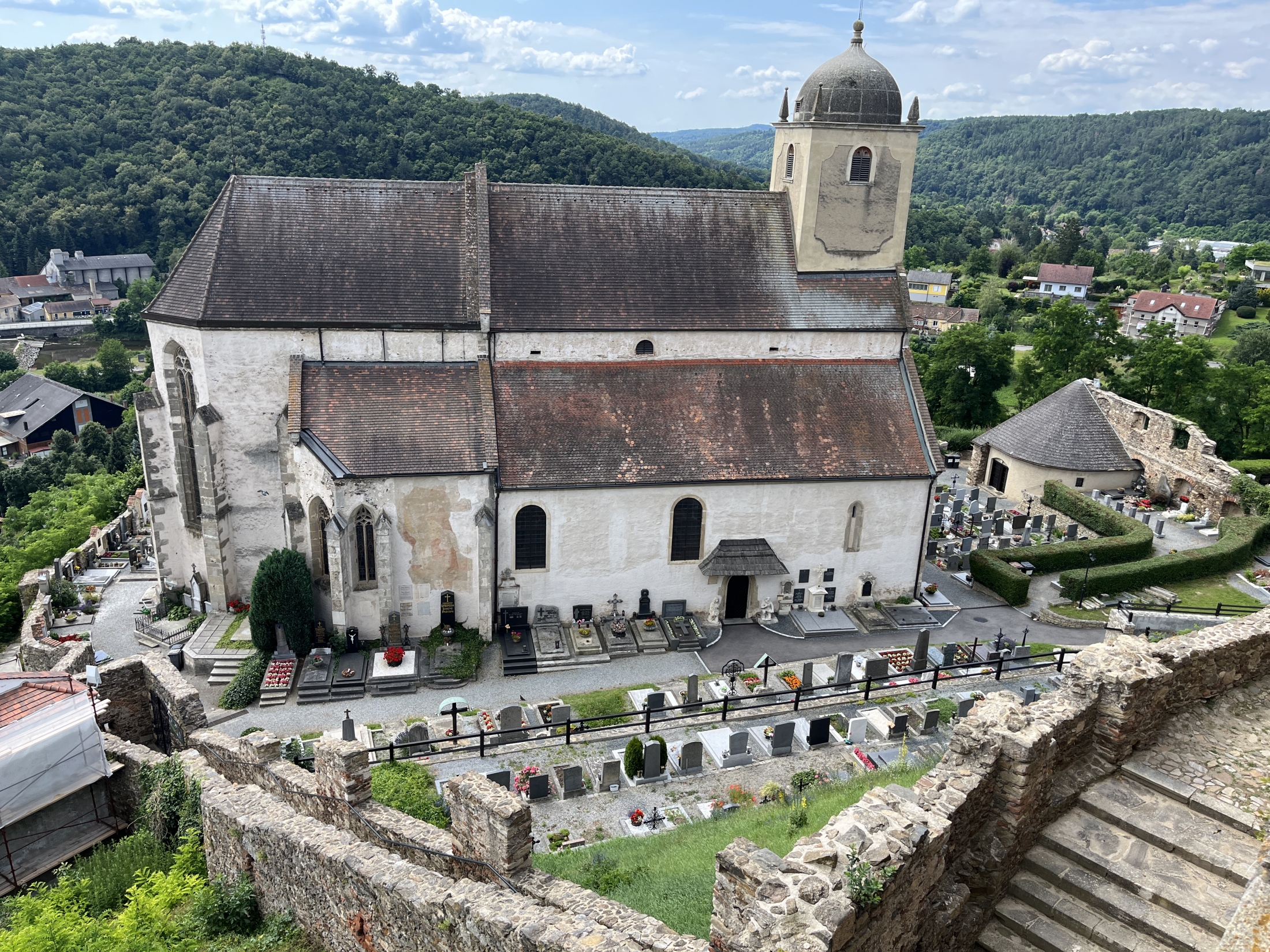Familientreffen im Waldviertel am 22. Juni 2024 im Gasthof Hagmann in St. Leonhard am Hornerwald nahe der Rosenburg. Sonja war wieder dabei. Ca. 50 Personen kamen und ein seltener Gast war auch dabei: Günther aus Kanada. Eine kleine Gruppe wanderte durch den Hornerwald. Nach Übernachtung im Gasthof Nussbaum in Etzmannsdorf besuchten wir am 23. Juni noch Gars am Kamp mit der Burgruine und der alten Kirche romanischen Ursprungs, um 1100 erstmals genannt und mehrmals umgebaut und erweitert (Bild ganz links). Dann fuhren wir zurück nach Steyr.