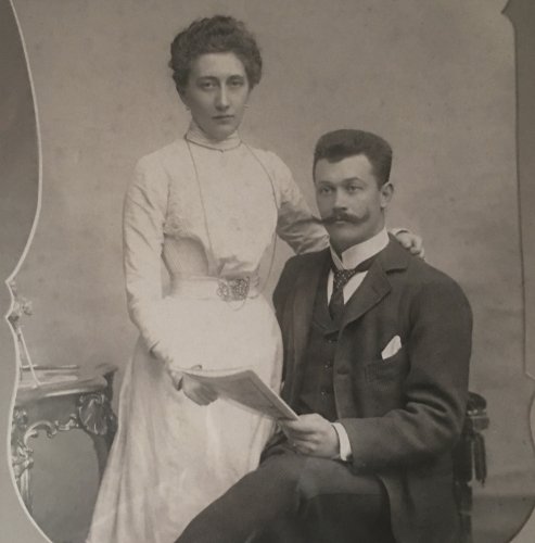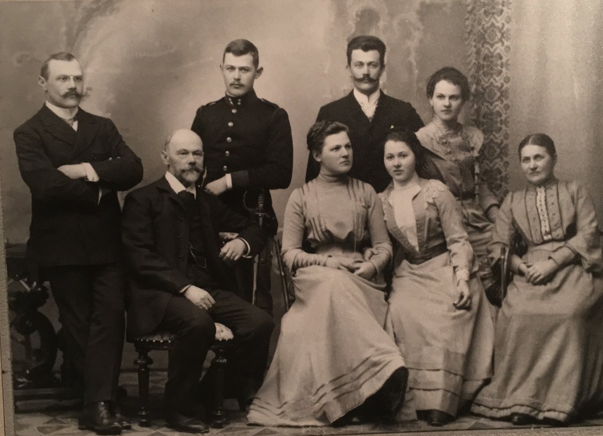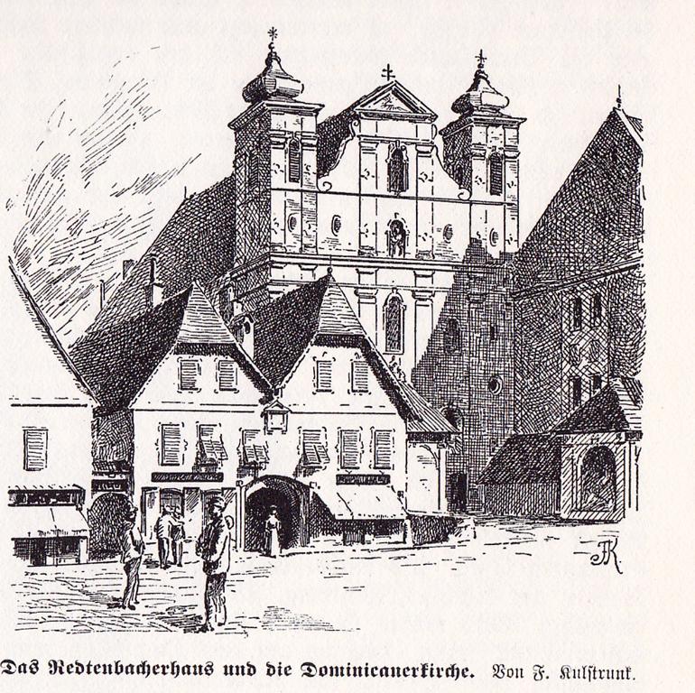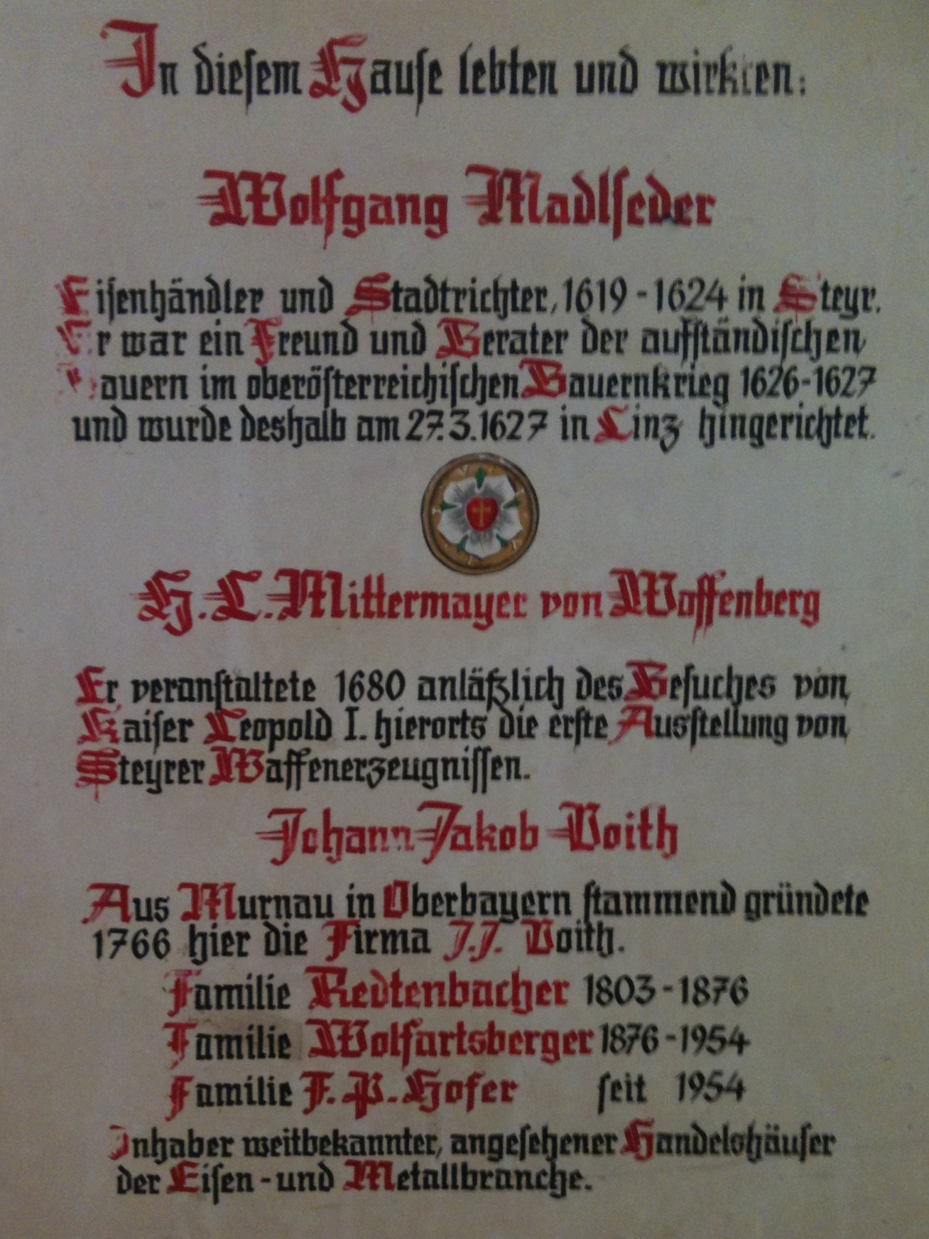 Schon um die Mitte des 19. Jahrhunderts betreiben unsere Vorfahren Peter Wohlfahrtsberger (*1802) und seine Frau das Gasthaus zum 'Grünen Kranz' im Haus Nr 4 am Grünmarkt. Dort gründen ihr Sohn Johann Wolfartsberger (*1840) und seine Frau Anna (*1843) eine geborene Haselroithner aus Wels (Foto rechts oben) 1870 ein Eisenhandelsgewerbe. 1876 kaufen sie das 'Redtenbacher- oder Madlsederhaus' gleich neben der heutigen Marienkirche (vormals Dominicanerkirche) und lassen das Geschäft im Haus Grünmarkt 4 auf. Das zweite Bild rechts zeigt eine alte Darstellung vom Haus am Stadtplatz Nr 39 von F. Kulstrunk. Das dritte Bild rechts zeigt die Familie Johann und Anna Wolfartsberger um 1904 mit den sechs Kindern (v.l.n.r. Josef, Johann sen, Anton, Theres, Auguste, dahinter Johann jun, Mitzi und Anna sen). Das letzte Bild rechts zeigt eine Inschrift im Haus Nr 39, die heute noch von vergangenen Tagen Zeugnis ablegt.