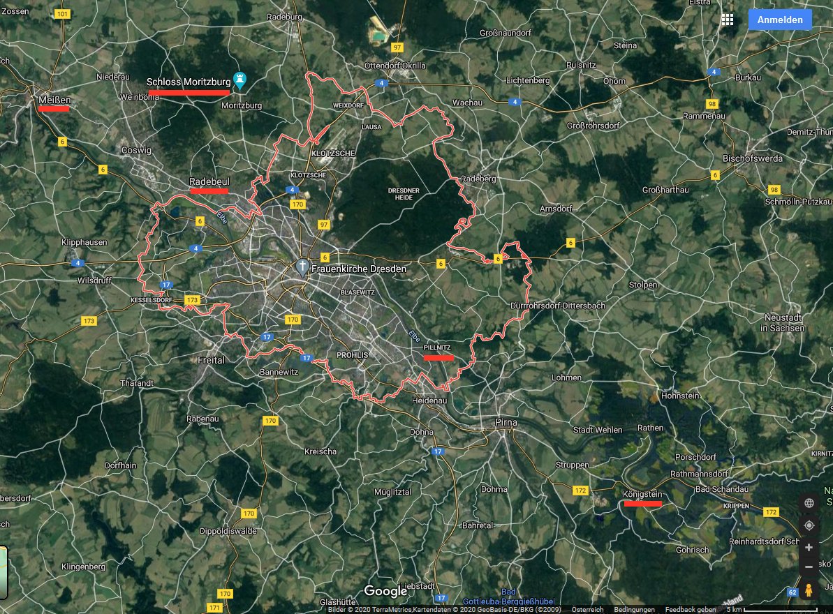 Am 27. August 2020 fuhren wir nach Dresden in Sachsen (Karte). Wir besuchten die sächsische Schweiz (Königstein) und fuhren mit dem Dampfschiff zurück nach Dresden. Weiters besuchten wir das Schloss in Pillnitz, die Moritzburg, Meissen mit Dom und Albrechtsburg sowie das Schloss Wackerbarth in Radebeul. Am 3. September 2020 fuhren wir wieder zurück nach Steyr.